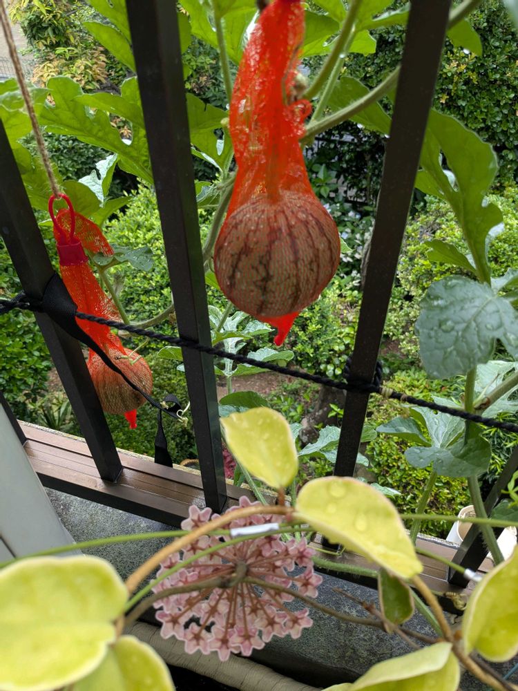 二階テラスでは…赤い小玉スイカと黄色い小玉スイカが成長中!!プランター栽培です
