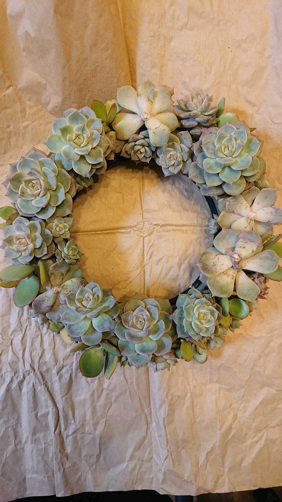 リースは、エケベリアが、外に放置してたら、どんどん増殖してろくろく首になるので😅たまたま家にあったリース台に挿しただけで簡単ですよ😂