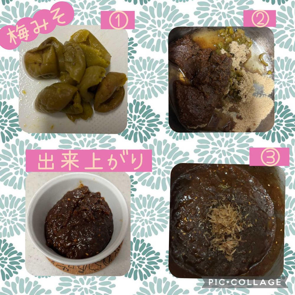 細かく刻んだ梅の実と砂糖、味噌、鰹節を混ぜて火にかけて、焦げない様に混ぜてトロンとなったら出来上がり