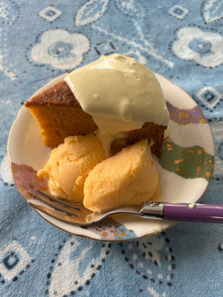 手作りキャロットケーキ、上にかけてるクリームチーズソース最高😋