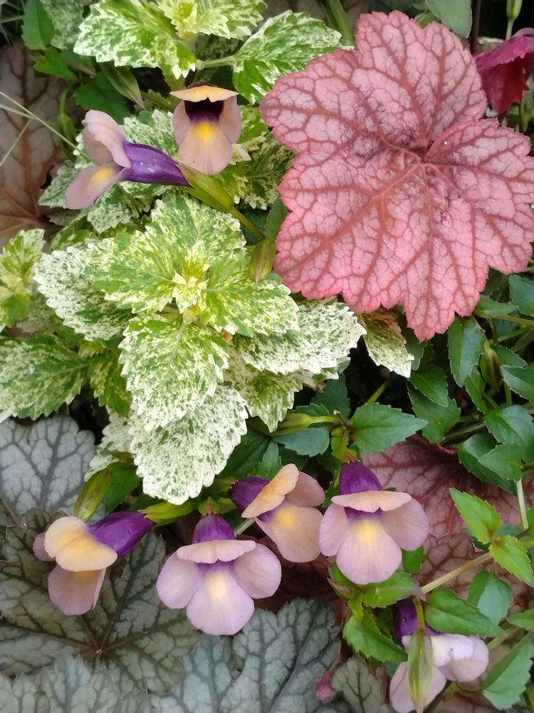 1️⃣ トレニアと斑入りカラミンサ、ヒューケラの寄せ植え