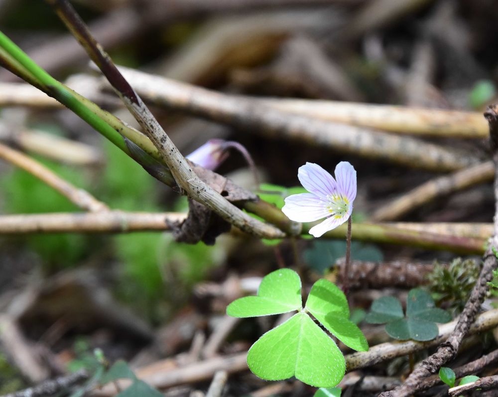 コミヤマカタバミは、白花にピンクに模様付き。