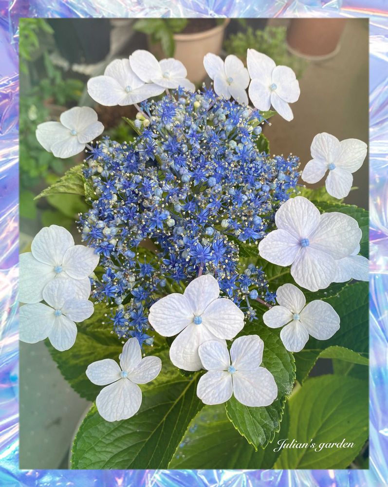 ①蕾から数回登場している斑入り葉の紫陽花 「スフレ」が最後のお花を綺麗に咲かせてくれました🤍🩵💙💚💖
