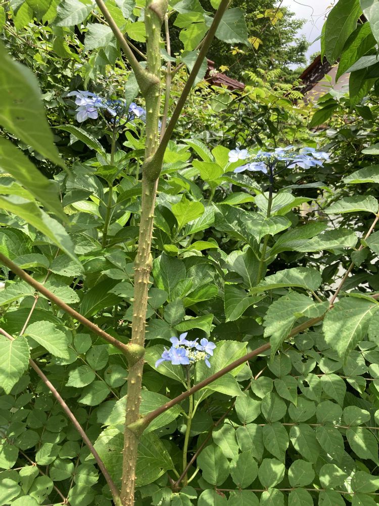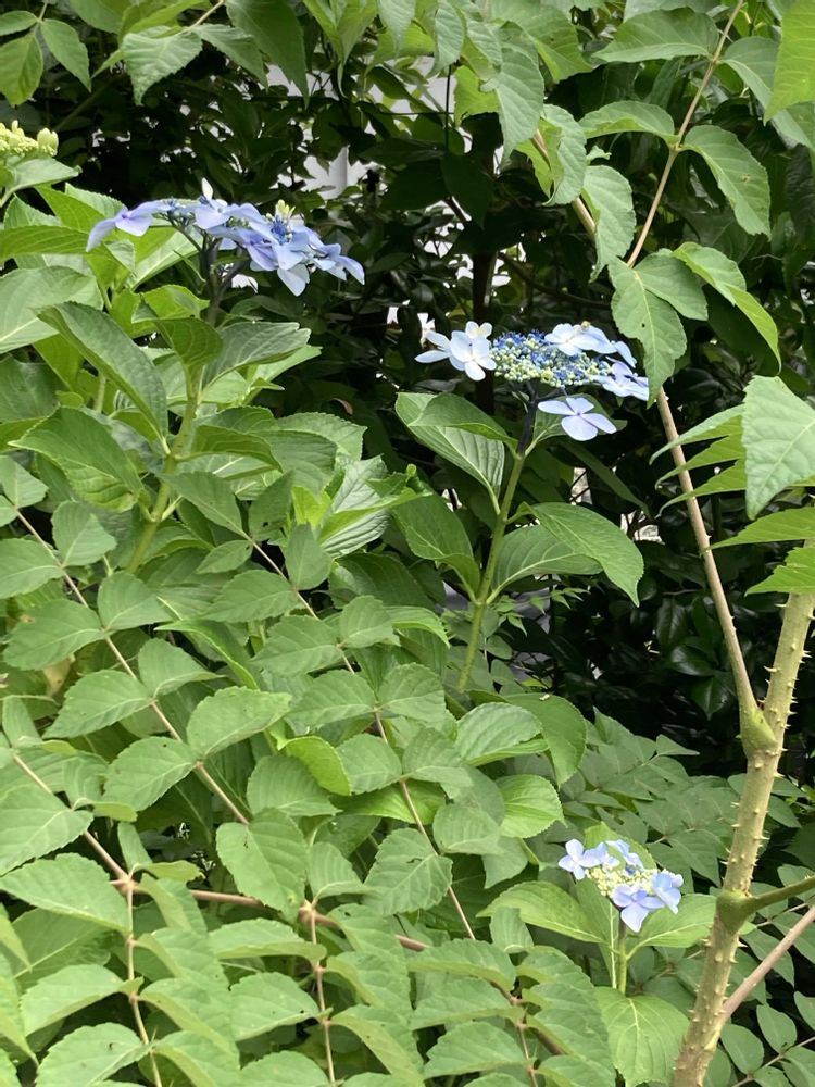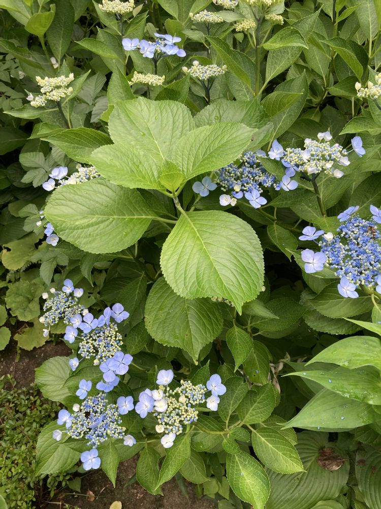 庭の額紫陽花が色付いてきました。高さ2m位、装飾花は最大6㌢位です。真花は濃い青が綺麗です。