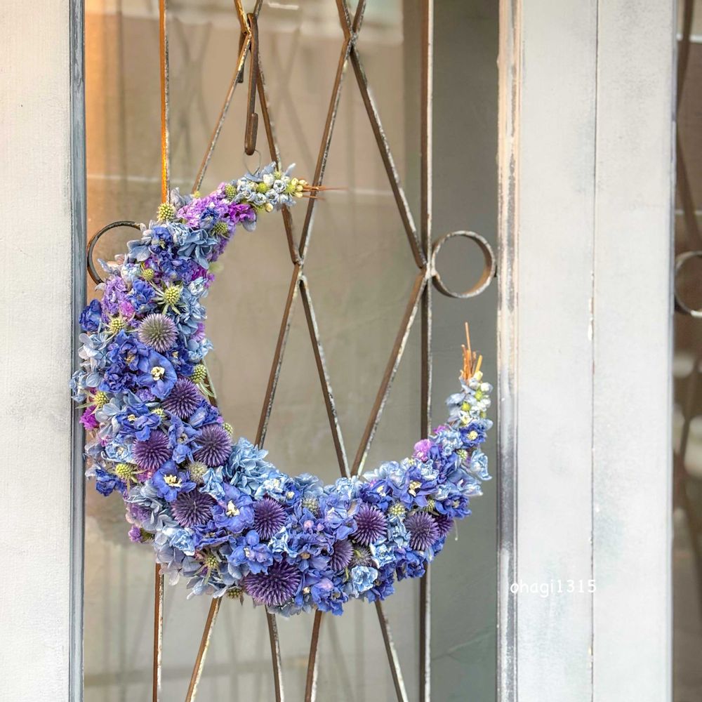 ベッチーズブルーやデルフィニウムをたっぷり使った贅沢なリース💕