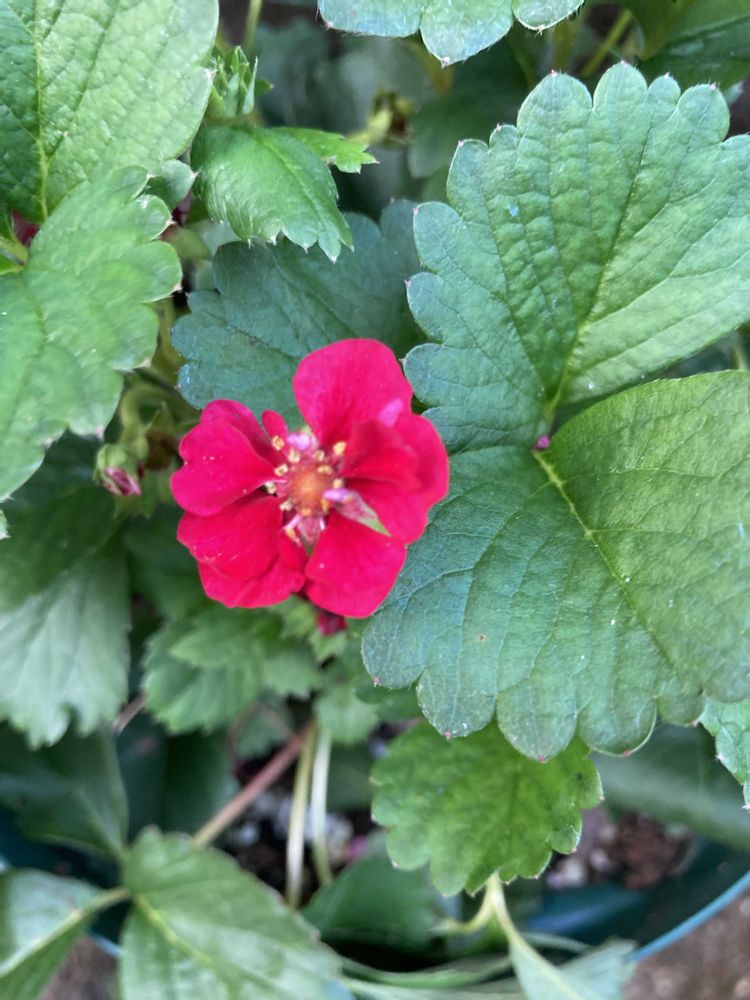 こんなに暑いのにイチゴなってます。昼間は暑すぎて、お庭に出られません。夕方になって少し風が涼しくなってきました。
