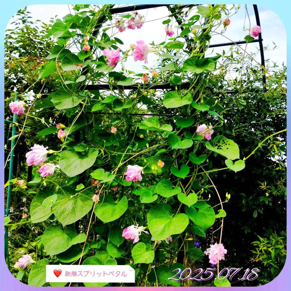 朝顔は家の前とかにも植えてあって葉が茂っているけど咲いているのはこの畑ガーデンの真ん中のアーチの所だけ。