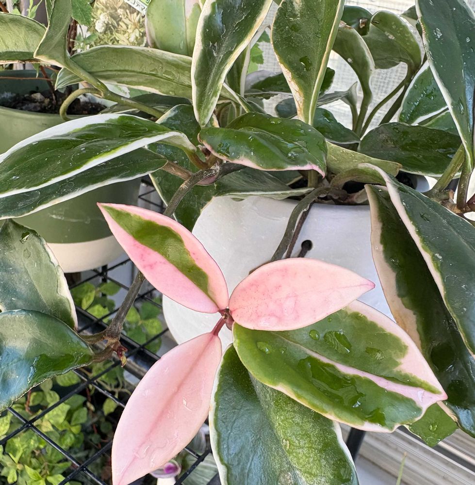 2️⃣⭐️ホヤ・カルノーサリップカラー 観葉植物2年目の夏はお外で過ごしてたら白ピンクの葉🍃が出て来てる💕