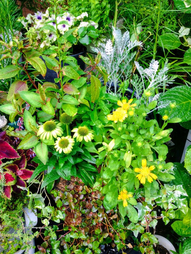 2年目の植えっぱなしの寄植えのエキナセア、ルドベキアがやっと咲いて中央にダリアの葉がひょろひょろ伸びて来ました🪴