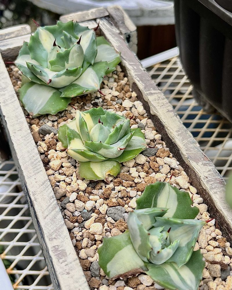去年水遣り不足でだいぶ小さくなった子達を、この春に木箱にまとめ植えしました😊根っこは木箱の中でわちゃわちゃになりそうですが、ガッチリと元気に育ってます