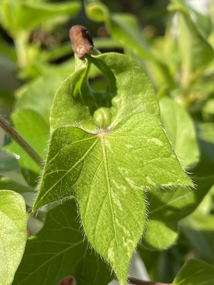朝顔の葉っぱについてる茶色い物は種のからだと思います🤎葉っぱにくっついて上がってきました🌱🤎