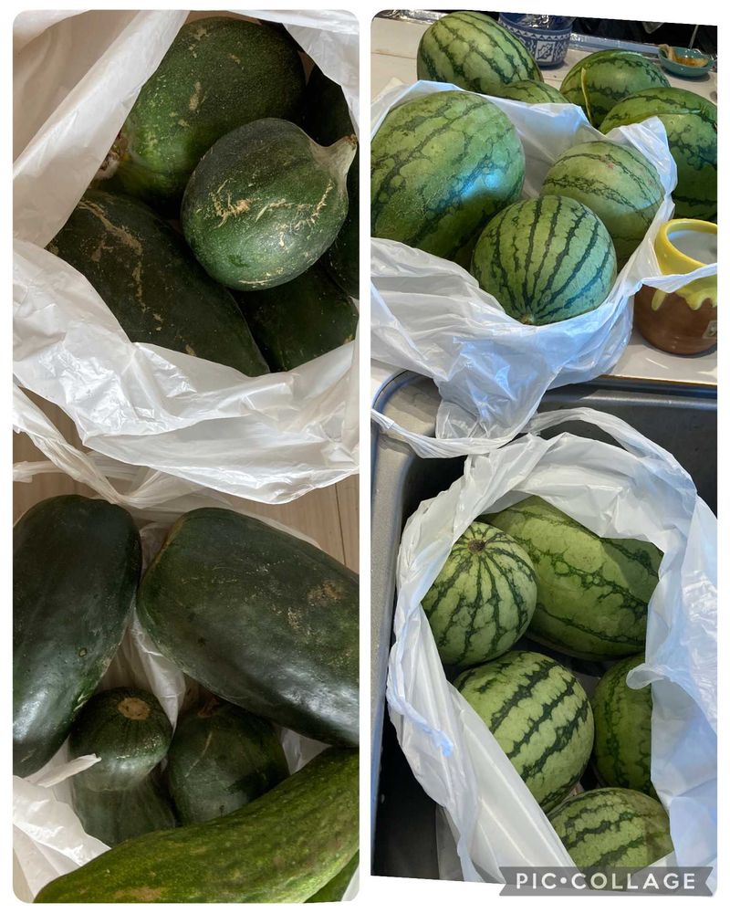 ④⑤相方が数日ぶりに畑に行ったら 小玉スイカ🍉と黒ウリがゴロゴロなってた ってこんなにどうする⁉️