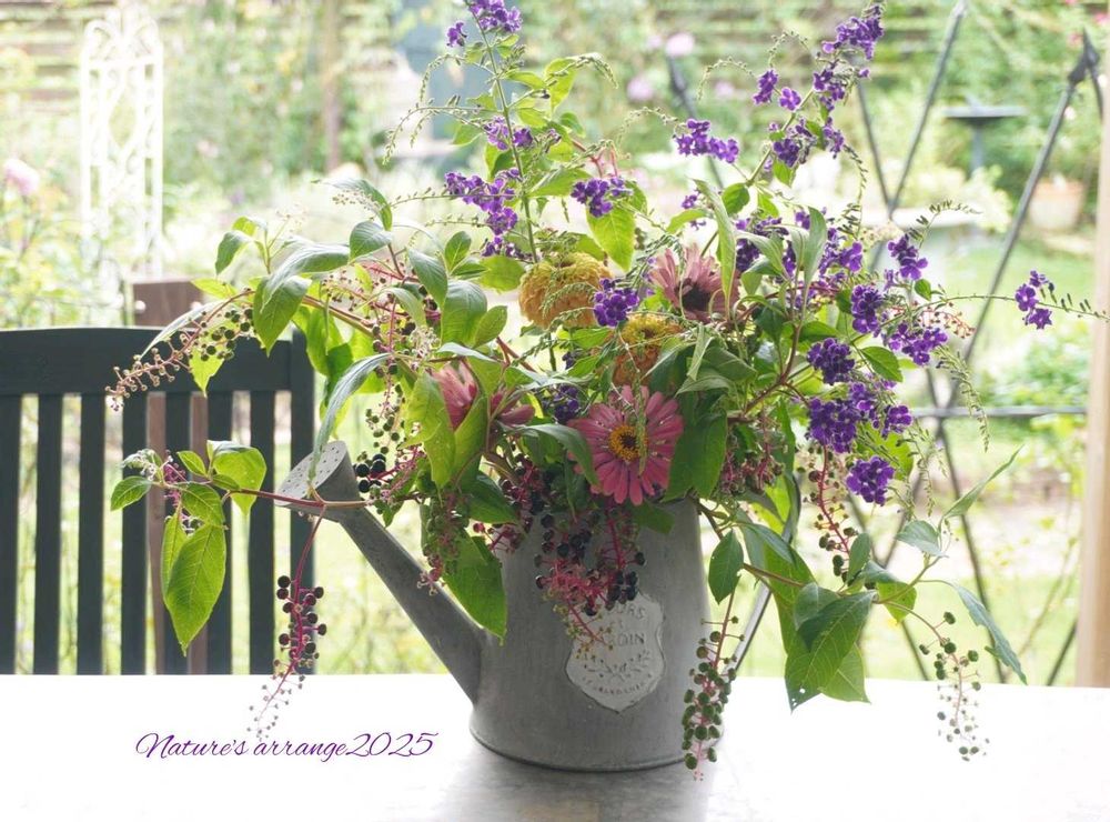 素敵なジョウロへの投げ入れ素敵ですね🌿私の子ども時代の夏の思い出のヨウシュヤマゴボウも入ってますね☺️
