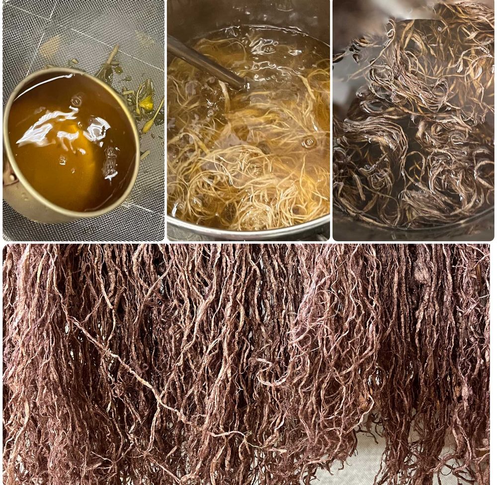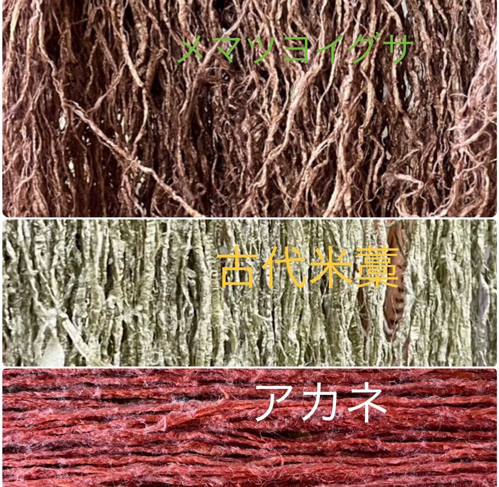 全草を5cm程に切り煮詰めて染色液を作りキビソ(絹糸の一つ)染めをした。先に染めたキビソ糸を合わせてキビソ織。