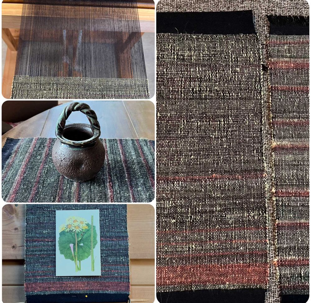 経糸(たていと)が黒色でもってキビソの横糸も地味な色ですからこんな感じに仕上がりました。 糸を見て織り上がりが全くイメージ出来ないので出たとこ勝負なんですよ〜😅 でもまぁ、最終的にはいつもお気に入りに仕上がってます🎶