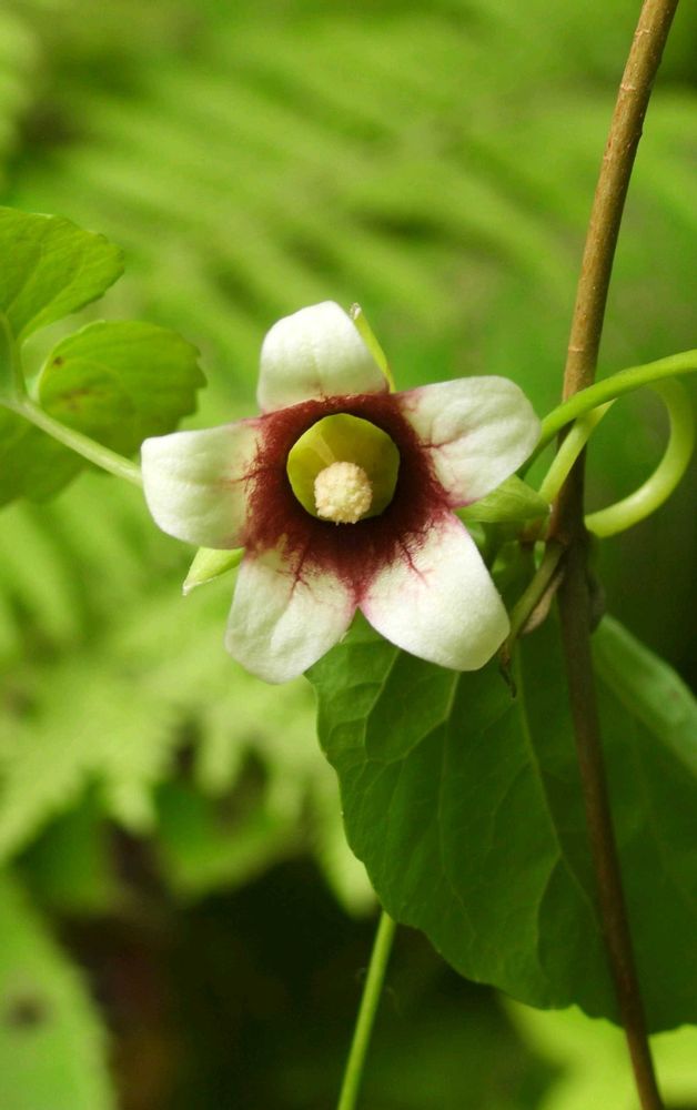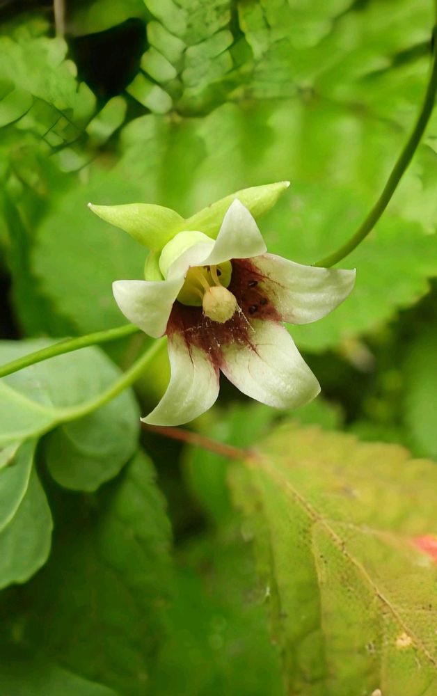 1️⃣2️⃣3️⃣ 花は葉腋に下垂して咲き花冠は広鐘型で1.2cm位、白色で内側は紅紫色、先が内部迄5裂し先端は尖って反り返っています。