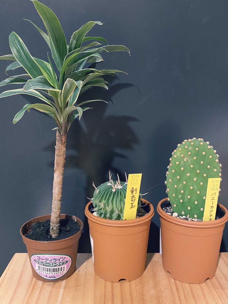 ②右がサボテンのバニーカクタス、真ん中もサボテンの剣恋玉、左はコーディラインのシルバーストライプ•••見たことある葉っぱだと調べたらコーディラインはコルジリネのことらしいです👀