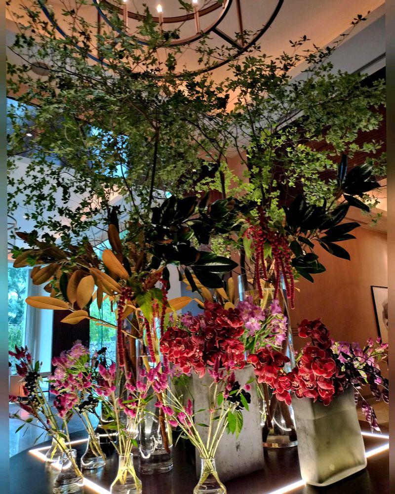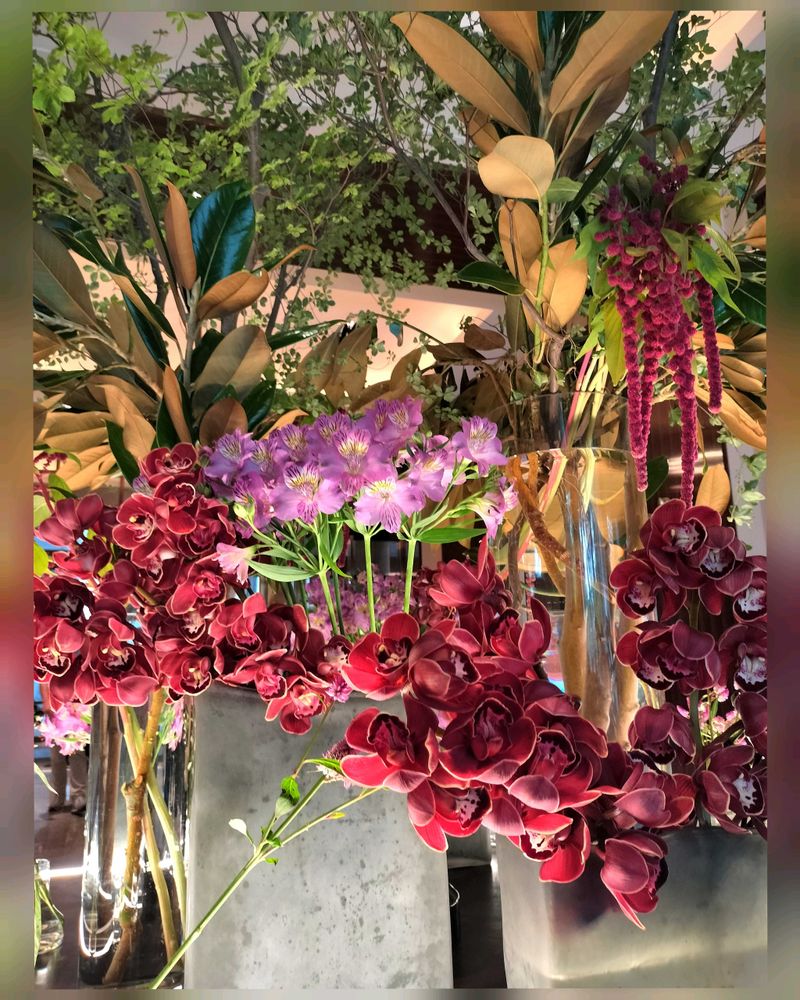昨日のパレスホテルのロビーのお花はワインカラーのシンビジウム、ベニヒモノキ、セロシアと、紫ピンクのアルストロメリアでした!!