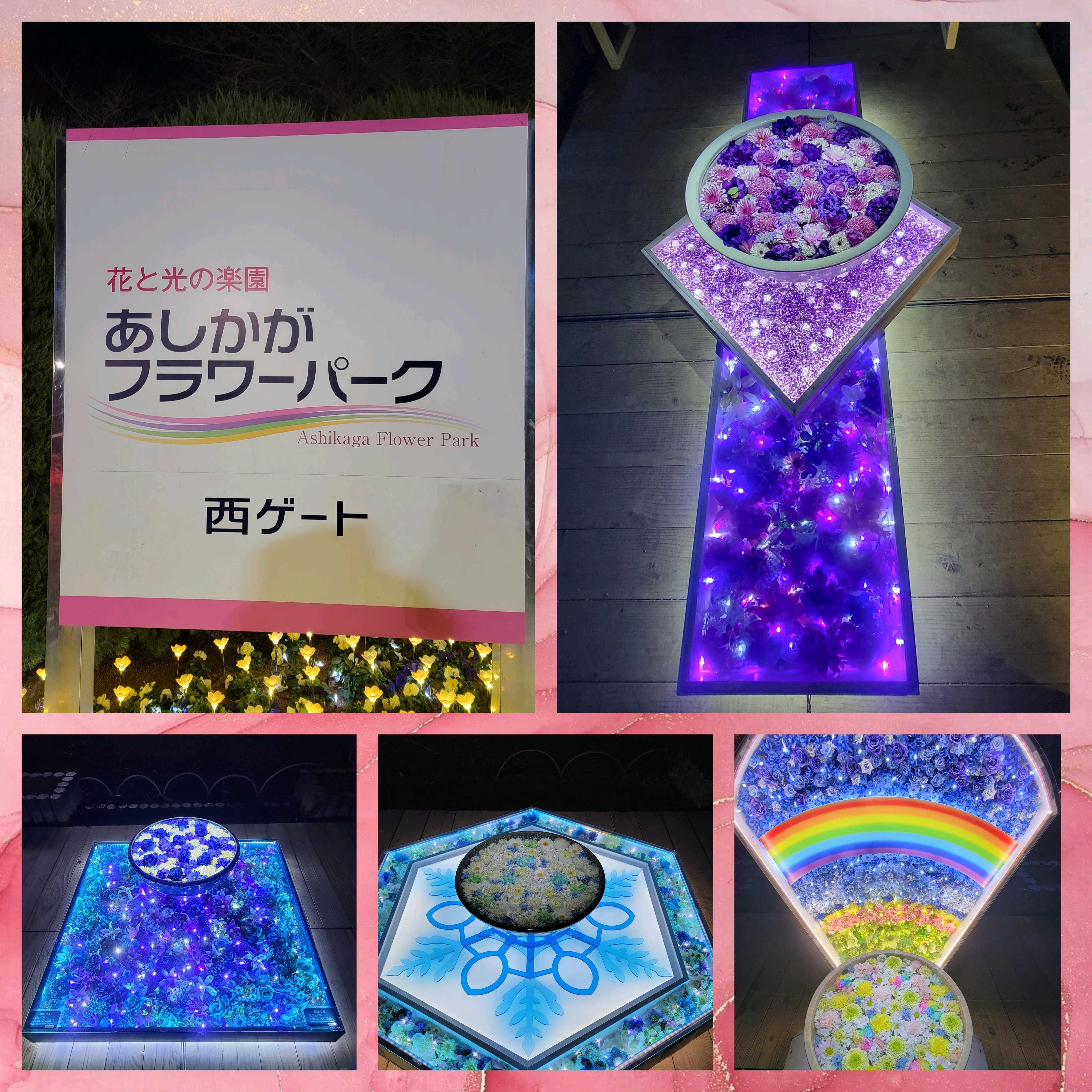 あしかがフラワーパークイルミネーションに行って来ました 夜の撮影なので見苦しいpiaも有りますが花手水とその演出が素敵なのでご覧下さい! 撮影🤳1月11日 花手水歴代のイルミネーション作品を表現しております 💬文章はプレートから引用してます