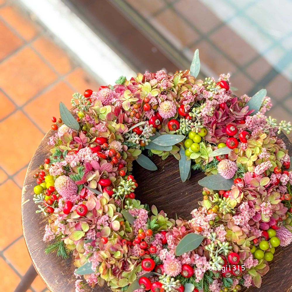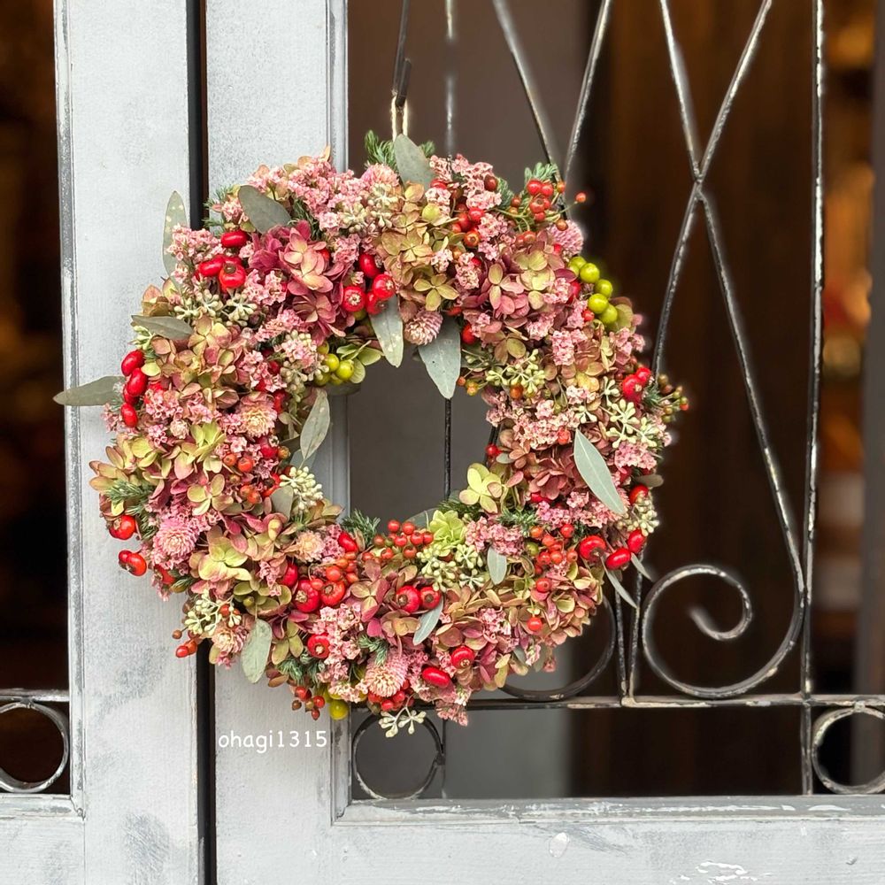 秋色紫陽花をたっぷり使った贅沢なリースです🤭