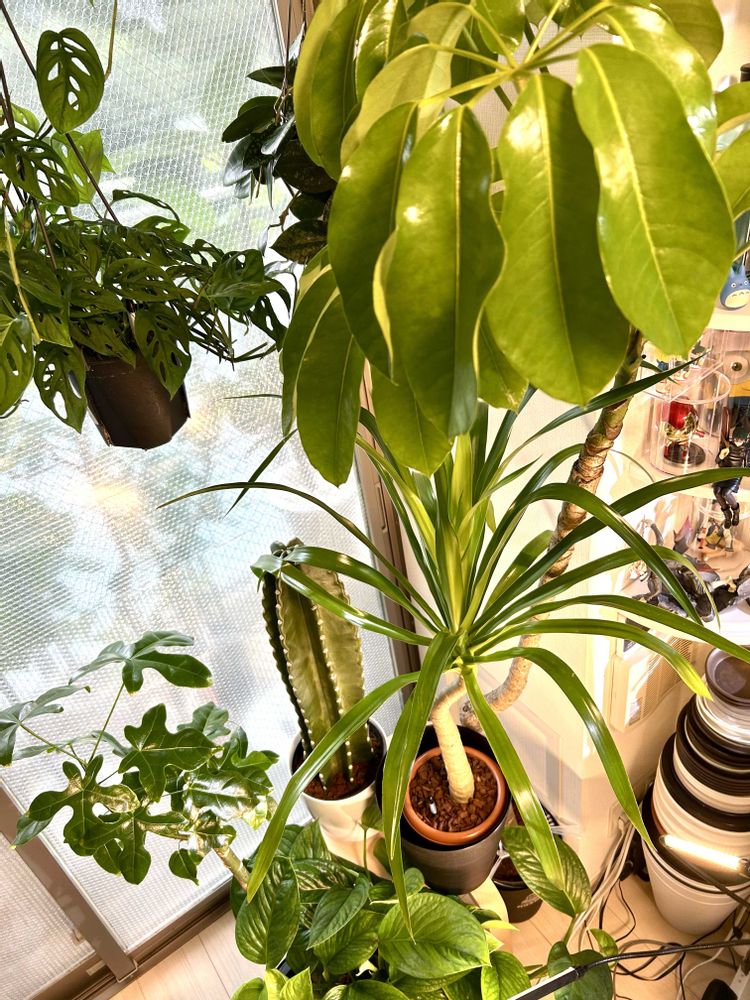 ブラッサイアをお迎えして南西のコーナーがいい感じになりました😊傘をいっぱい☂️さしたような柔らかな感じがアンブレラツリー🎄🌲と言われる由縁なのやかなぁと思いました😊葉っぱの優しい感じの色合いも大好きです〜😊