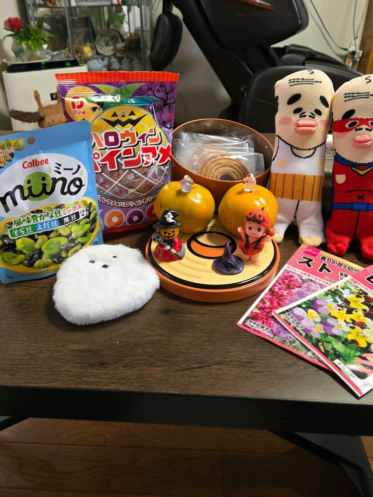 沢山のお菓子や飴🍬、お花の種、シマエナガちゃん、🎃キュピ取り替え用の帽子も🥰 ハロウィン人形や柿と柿の上のアルヒに乗った目玉おやじ😊何時もながら手作り凄い🥰