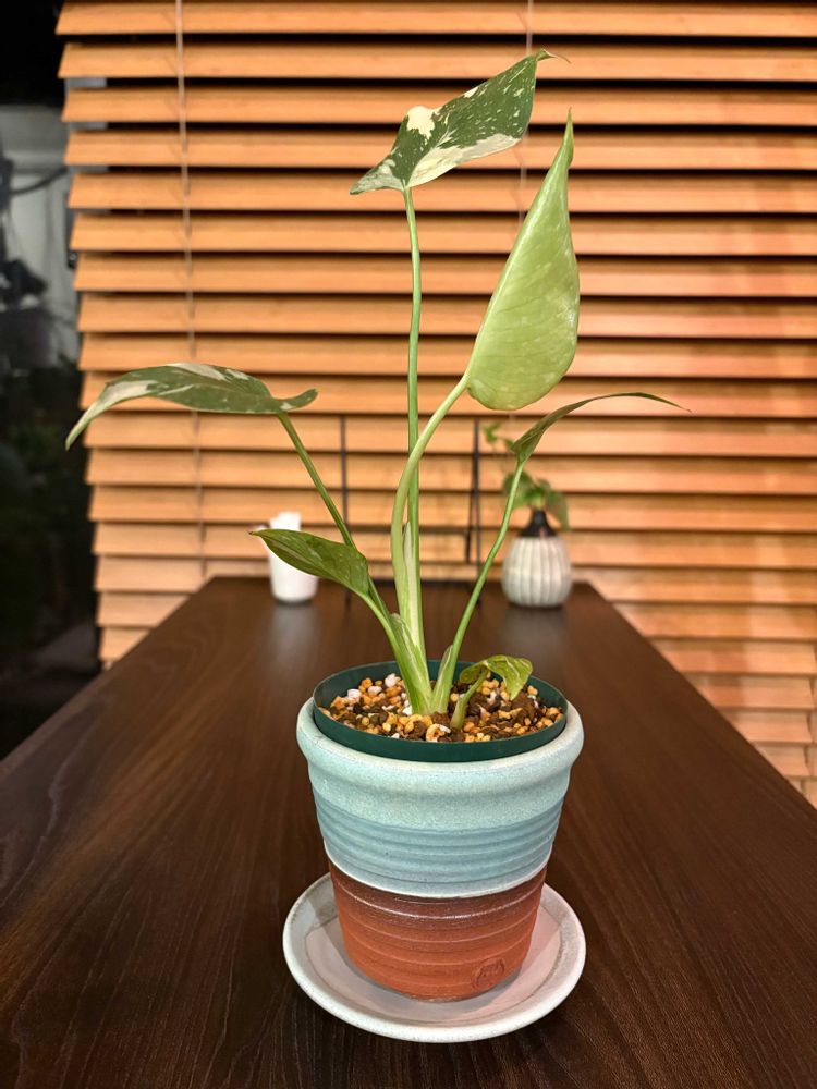2025.8月に某サイトで購入した【アロカシア チャイ】の 突然変異?なんだろう 購入時、元々有った葉を(1枚目の葉)として、 下から新たな葉が出てきてる状態で到着しました(2枚目の葉) こちらに来て初めて出てきた葉に異変が。。 育て始めて出てきた初めての3枚目、4枚目 (途中から、斑1、斑2、、と続きます) どこまでこの謎の斑入葉が続くのか、 いや止まるのか……記録していきます