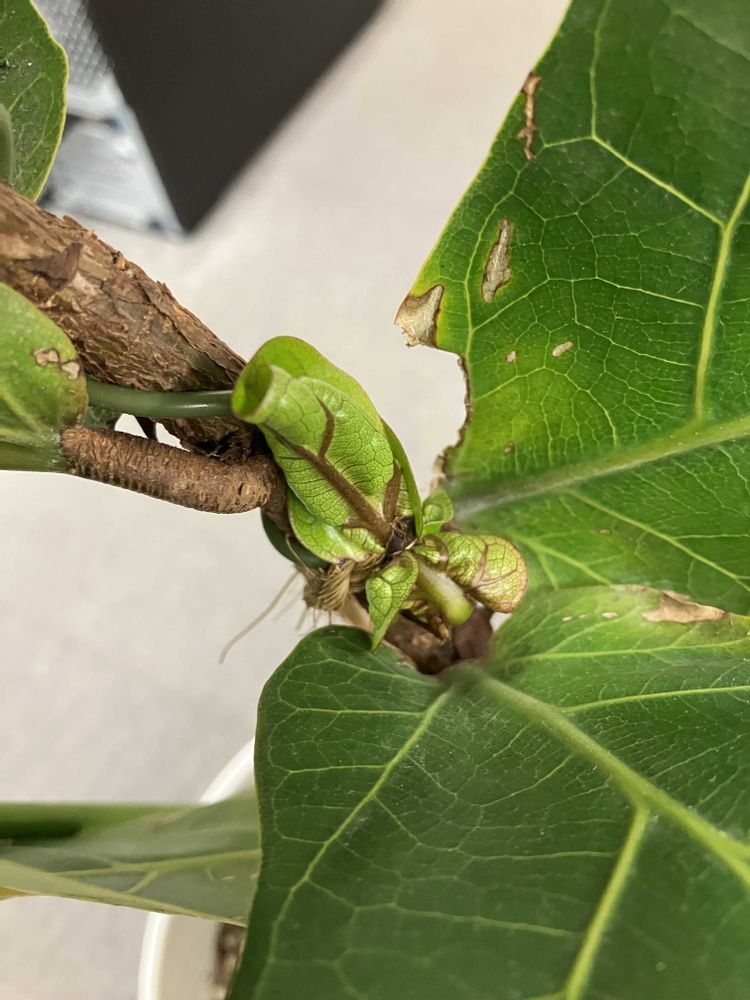 曲げたゴムの木から脇芽が出ました