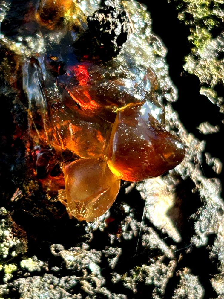 琥珀になる木は限られているのでこの木の樹液がなるかは分かりませんが、こんな感じのものが、長年かけて化石になっていくのかな?