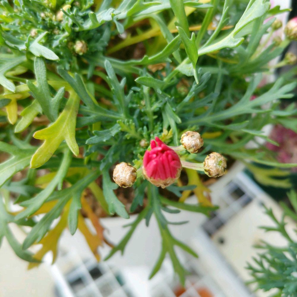④三年目のマーガレット 苺ミルクの第一号ももうすぐ咲きそうです。