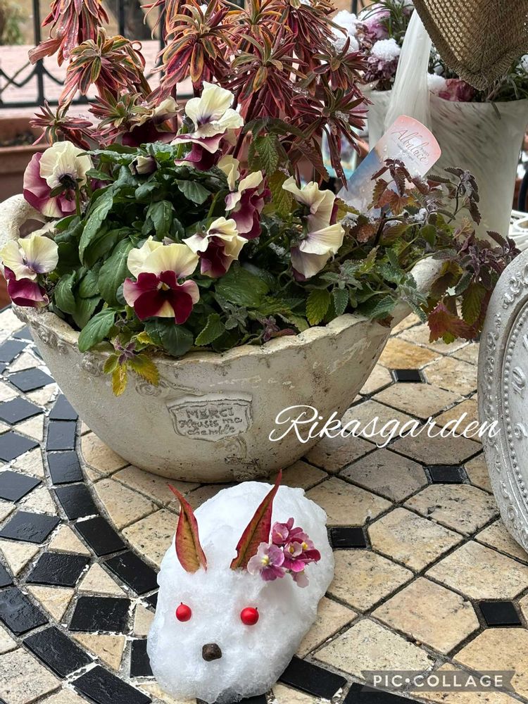 朝起きたら、年に一度降るか降らないかの雪が少しだけ残っていたので童心にかえり急いで作りましたよー。花飾り可愛いでしょ🤭