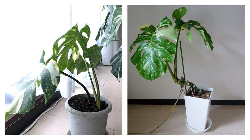 某オークションで2株2,200円で落札した斑入りモンステラ。梅雨(と飼い主の管理能力)のせいで途中で葉っぱ一枚に。持ち前の生命力で生き延びれるかモンちゃん。