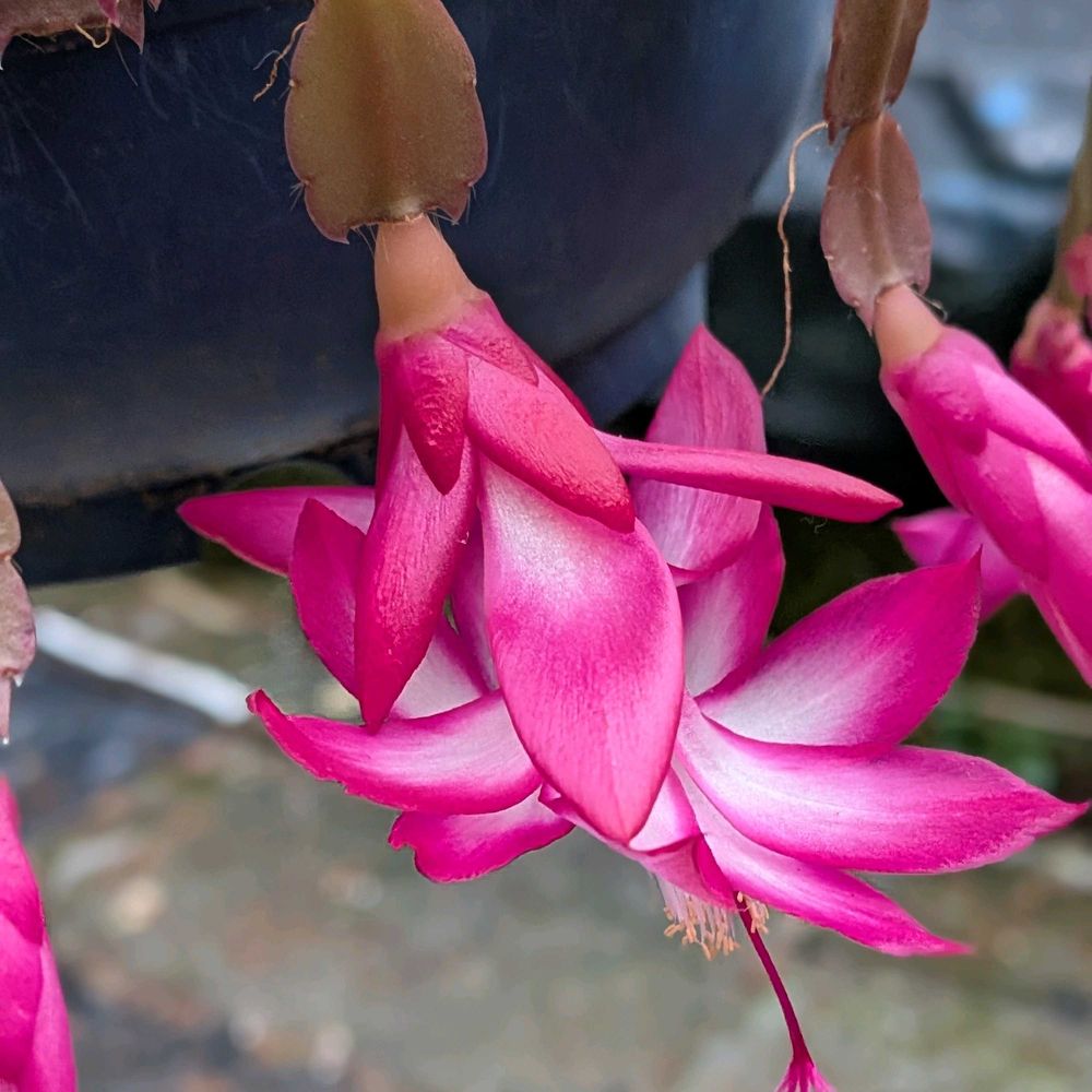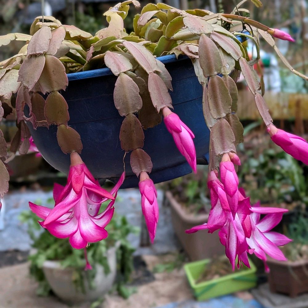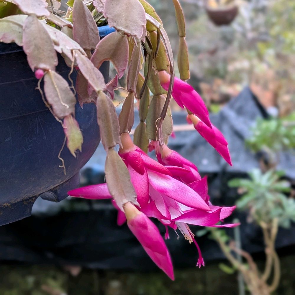 我が家のシャコバサボテンつりかご似て、咲きました、久し振りの雨☔の朝です、☔☔☔🌹