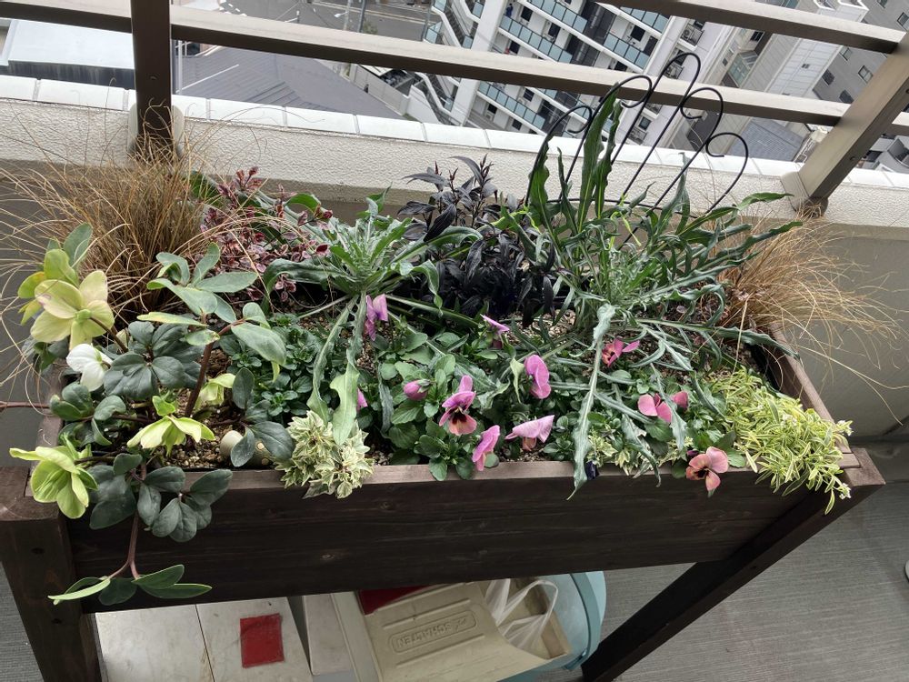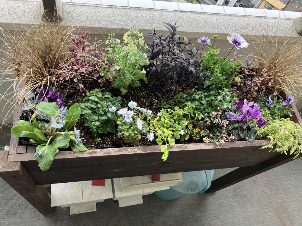 春用のプランターがイマイチだったので、部分的に入れ替えました。ピンク系から青紫系にチェンジ。2枚目は作業前。