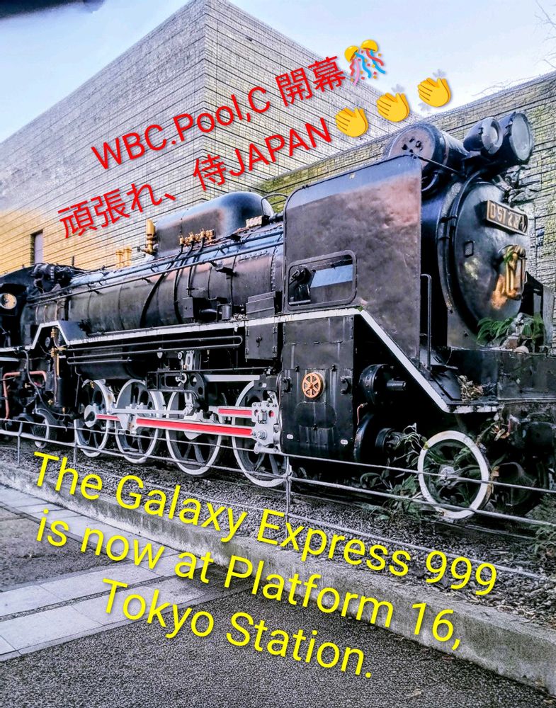 👨✈️「お待たせしました。ただいま銀河鉄道999は、東京駅16番線に到着しました。さぁ、WBC,Pool.C(東京プール)が本日から開幕です。会場となる東京ドームの最寄りとなる『水道橋駅』『後楽園駅』へは、JRまたは東京メトロをご利用ください。なお今後の999の行き先は、侍JAPANの勝ち上がり方によって異なりますのでご注意ください。」 【侍JAPANの試合日程】 3月6日(金)19時〜 VS 台湾 3月7日(土)19時〜 VS 韓国 3月8日(日)19時〜 VS オーストラリア 3月10日(火)19時〜 VS チェコ