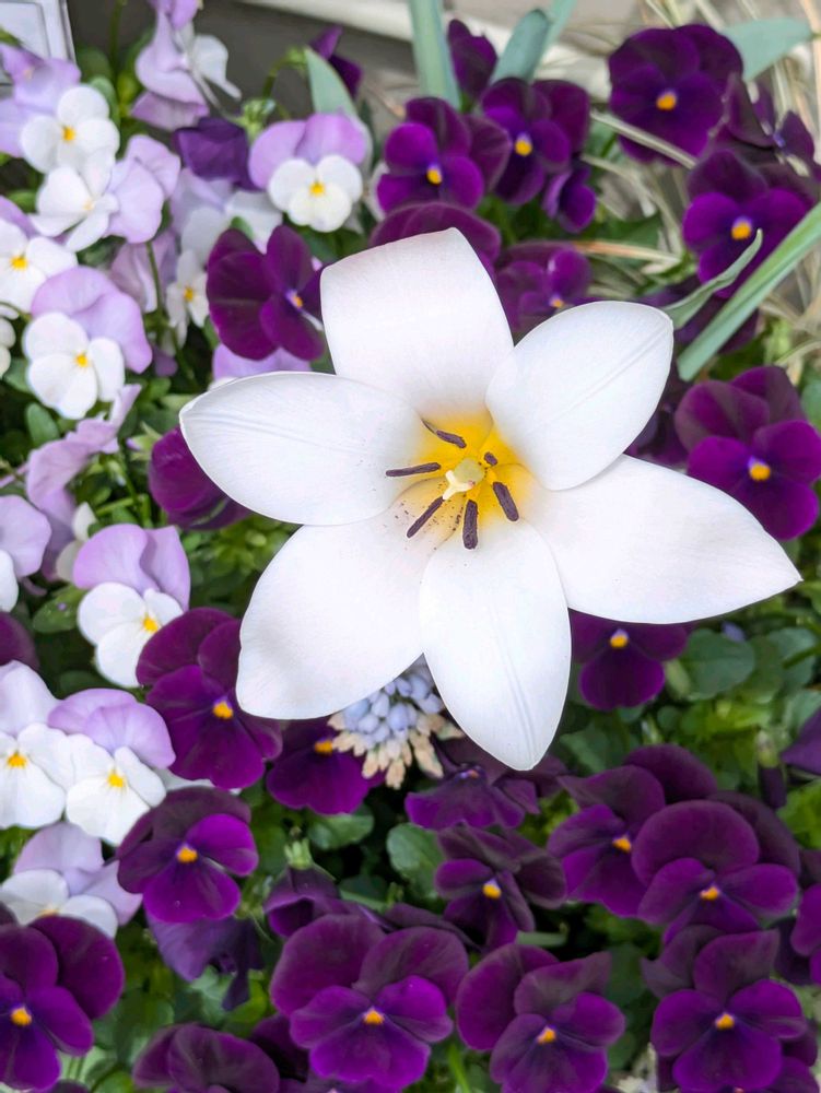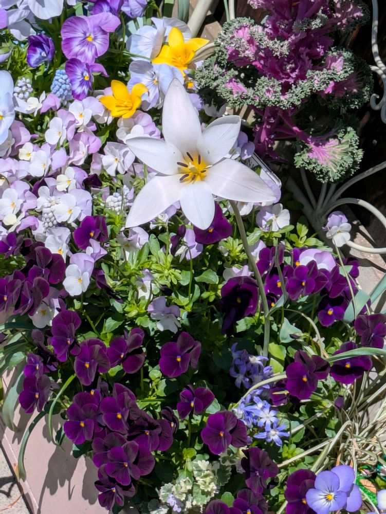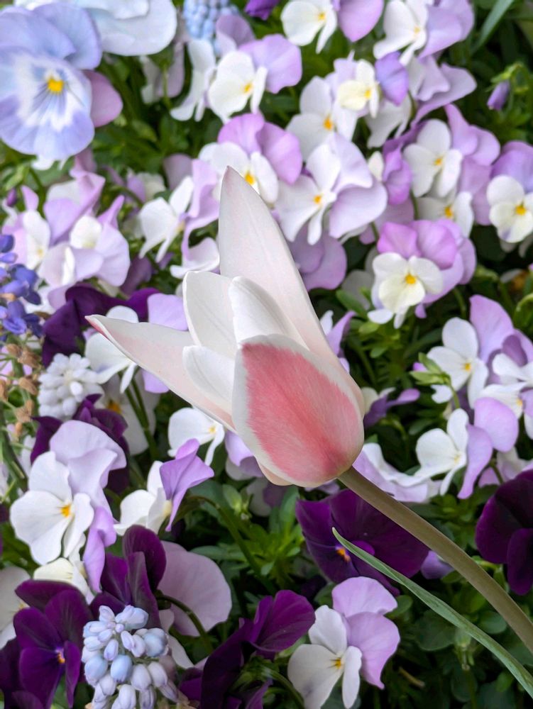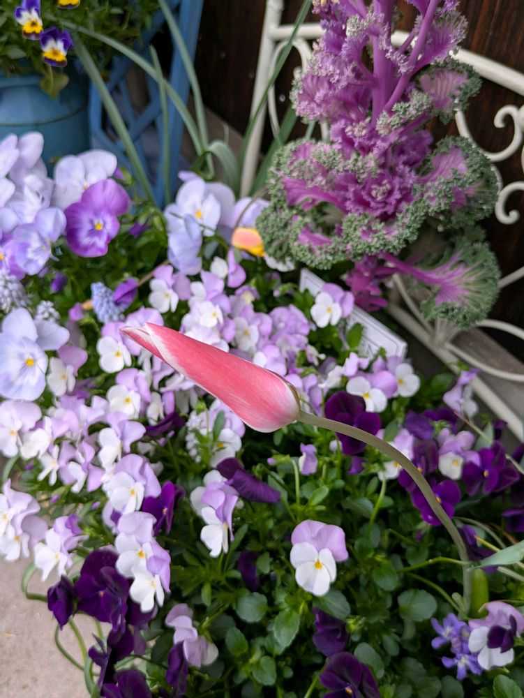 2⃣チューリップの雄しべが、足下のビオラと同じ紫色だった💜