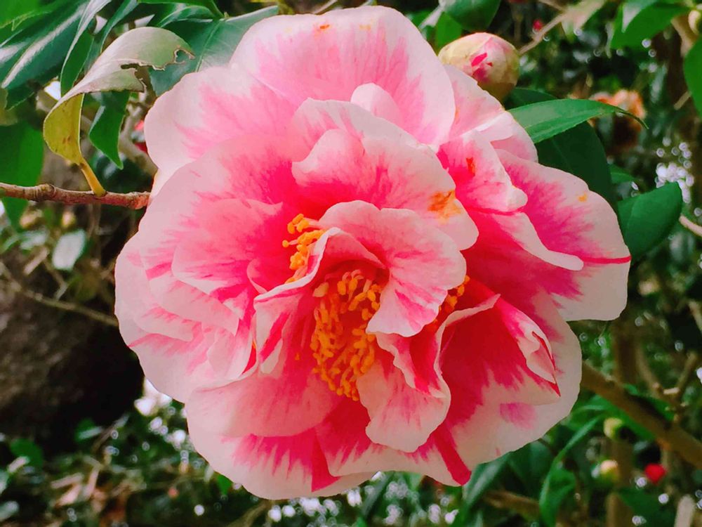 淡紅色地に紅色の縦絞りや白色の覆輪が入る、牡丹咲き、散りしべ、大輪のツバキです💖