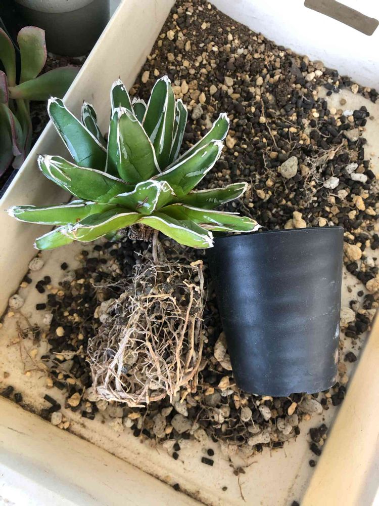 植え替え祭りで昨年根出ししたアガベ 姫笹の雪を植え替え。葉に対して小さな鉢でしたのですっかり根が回っていました。土を落としても鉢の形に太い根が。面白かったのですがほぐします。