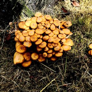 散歩道のキノコ 散歩道にキノコが生えていました。 群生しています。 ググって見ると、ナラタケ or ナラタケモドキと出ました。 どちらも、加熱処理をすれば、食用になるらしいのですが、怖いので食べません。