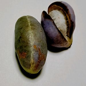 散歩道の途中の庭に、アケビとムベができて居ました。 家主さんの許可を得て、アケビとムベを頂きました。弾けるのがアケビ(最初の写真)で、二枚目の写真の赤い大きい弾けて居ない実がムベです。 どちらも、種の多い果実で、周りの甘いワタが食用になります。