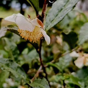 散歩道(京都丹波亀岡 古世町)の茶花 散歩道に茶花の花が咲いて居ました。 白い清楚な花です。