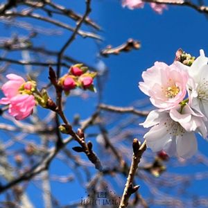🌿🩵🌸🩵🌸🩵🌿 🌸 冬桜 🌸 🩵 🌸 🩵 🌸 🩵 おはようございます。 今日も!一日良いことが!!! 有ります様に 🌿🌸 桜咲く冬の日射しに 🌸🩵 風~も無く 大空に 映え包まれて冬桜~ 春の足音まだ遠し・・・ 春待つ日々の永いこと お寺の庭の片隅で!!! さくらに聴きました 「梅は桜は」まだですかト?