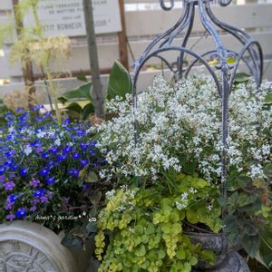 泡のような小花 (苞) が長期間咲き続け、ボリューミーな草姿が楽しめるユーフォルビア *ダイヤモンドスノー* お気に入りのアイアン鉢に、リシマキア2種類と寄せ植えにしています 暑くて大変な時期、手間要らずな植物はありがたい🙏