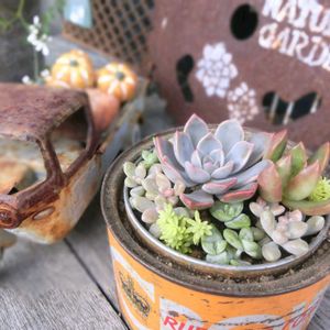 裏の家でハロウィンカラーのレトロ缶を見つけたので 多肉さんを寄せ植えしてみました🎶🎶 挿し芽っ子のユーフォルビアのお花も咲いてきました🌼🌼🌼