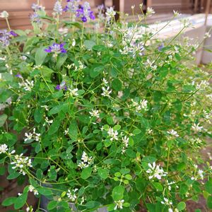 こんばんは⭐️ カインダーブルーです💜💜 遅咲きなので、早めに夏剪定しましたが、ちょうど良いかな😄 とっても美しく咲きました💜💜 バックの白花はユーフォルビアダイヤモンドスノウです♡ 今日は寒かったですねー🥶 暖かくしてお過ごしくださいね🍀