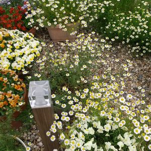 今日の我が家の庭です。今は白いカモミールと黄色いホメリア、フリージア、ビオラなどが主役です。これから紫色のチドリソウやサルビアの仲間が咲き出します。🤗🌼🏵️