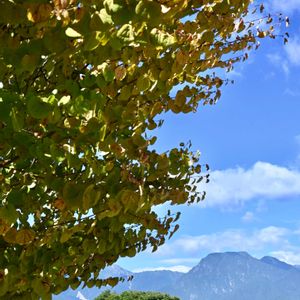 「木曜日は木」 カツラの黄葉始まる💚🧡🤎🎶 甘い香りは健在でした〜✨🧡🎶 画像右下に見える有明山とのコラボ🎶 北アルプス展望美術館 (池田町立美術館)からの展望と 安曇野アルプス公園のカツラ 別名「信濃富士」と呼ばれる有明山を正面に、北アルプスの裾野に広がる安曇野の田園風景が一望できる高台に建つ美術館です。
