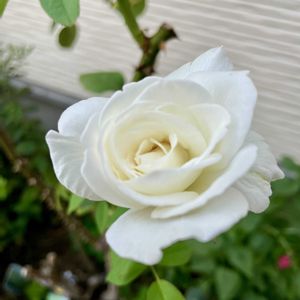 真っ白な薔薇 ユキサン 我が家にも待ちに待った薔薇の季節がやってきました♪ 山林火災からの避難のため、2月から3月にかけて 水やりができない期間が12日間ほどありました 恐らくその影響もあったかと思います…鉢植え薔薇を2鉢枯らしてしまいました…😢 そんな中、開花してくれたユキサン、よくがんばったね、ありがとう✨