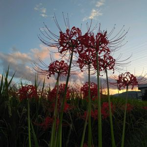 今年も彼岸花の開花が少し遅かったみたいで、 もう9月も。 田んぼの畦道、 夕焼け空に真っ赤な花が映えました。