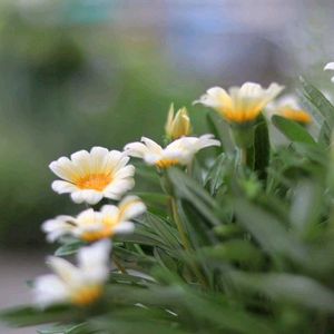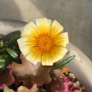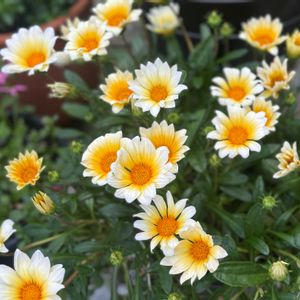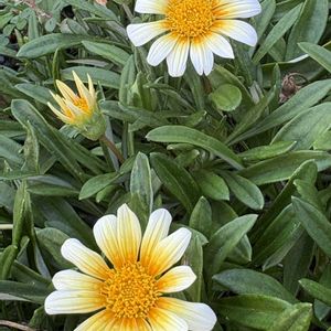 ガザニア ビースト カナリアスマイル 淡色の花弁に、中心が黄色が涼しげです 📝 4~5月に咲いて 花が少し減った6月初めに 梅雨の蒸れ予防のタイミングで 鉢の内側まで切り戻して✂ 中央は 株元の生え際まで 中間~端は 段々 それでも密集するので 茎数を減らしカット 数年目の苗(冬に 株元をざくり株切り) 6月下旬に再び開花🌼 7月7日(←②写真を撮りました) いまは段々減り ときどき1輪くらい 雨ざらしだから 茎元の葉は徐々に黄色く腐り 葉は丈夫で硬めなぶん 荒く扱うと折れます ・水やりは 斜め横から土へ ・枯れ葉は 時々そっと掻き分け 手やピンセットで取ってる 良い葉を痛めずらいかなぁ。 カラーリーフ鑑賞中🌿.∘ (追記) 7月下旬~ 希釈液肥を与えだしてみた 8月初~ 蕾から花が数輪づつ咲いてます PWさんから発売された当時は 中心部の蘂が黄色だ! というだけで飛びつき 育て方も情報も少なく 調べる暇も無く。 切り戻しをせず そのまま茎を秋までずっと 数本の長いヘビのようでした🐍 初冬に1回✂ 毎年、なぜ伸びながらで花が少ないんだろうと 途中で1度 退場いただいた記憶があります 時代で情報も増え 梅雨の剪定を知りました。 場所が無い問題で コンパクトに育ててます♡